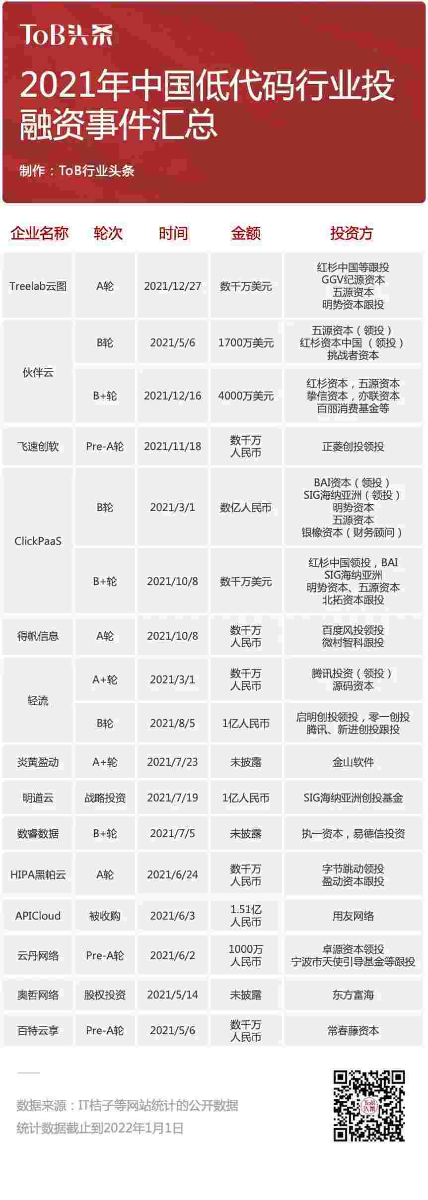 到2021年,,,无/低代码投融资规模势头更甚,,其中包括轻流两轮融资(A+轮数千万人民币,,B轮近亿人民币)、、美团钱包商家版 两轮融资(B轮数亿人民币,,,,B+轮数千万美元)、、、、百特云享数千万元Pre-A轮融资......