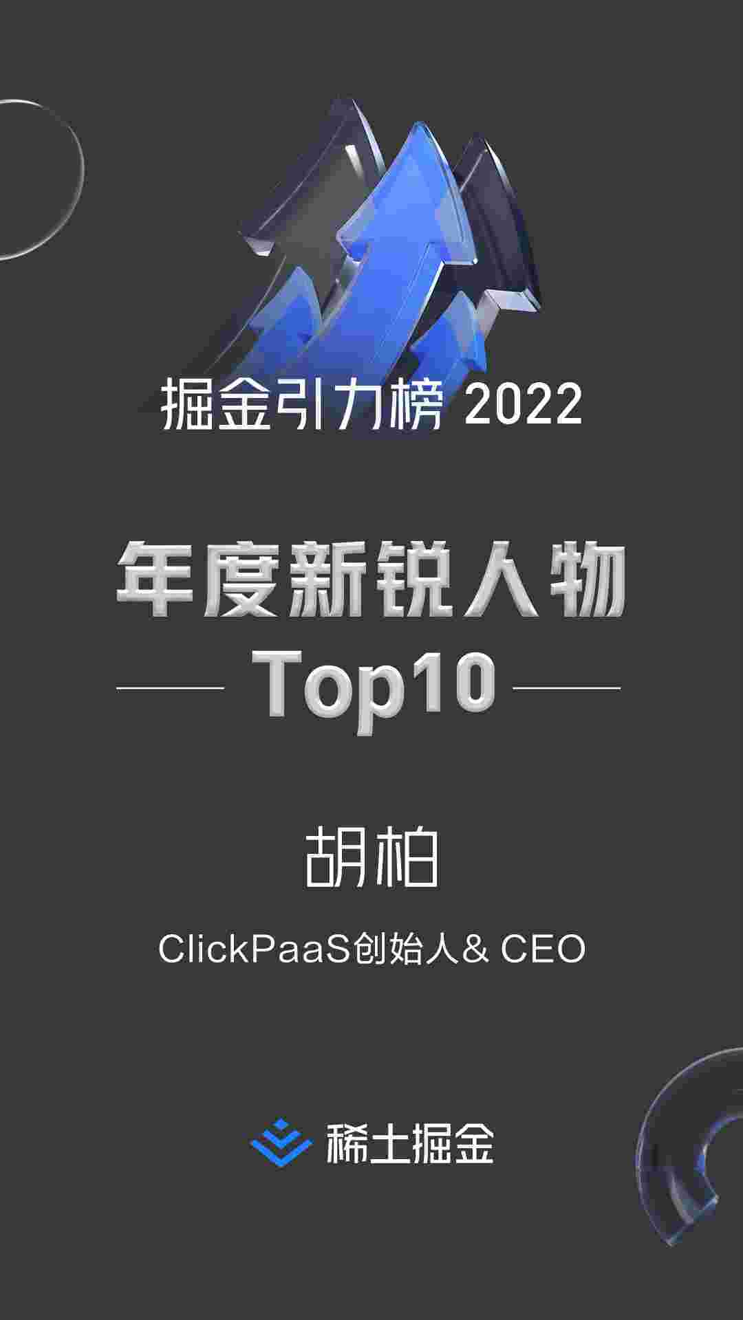 2022年1月6日,,,,稀土掘金社区第一届「掘金未来大会」成功举办,,,会上发布了“2022 稀土掘金引力榜 年度新锐人物”榜单,,,,上海爱湃斯科技有限公司(简称美团钱包商家版)创始人及CEO胡柏实力入选年度新锐人物TOP 10。。。